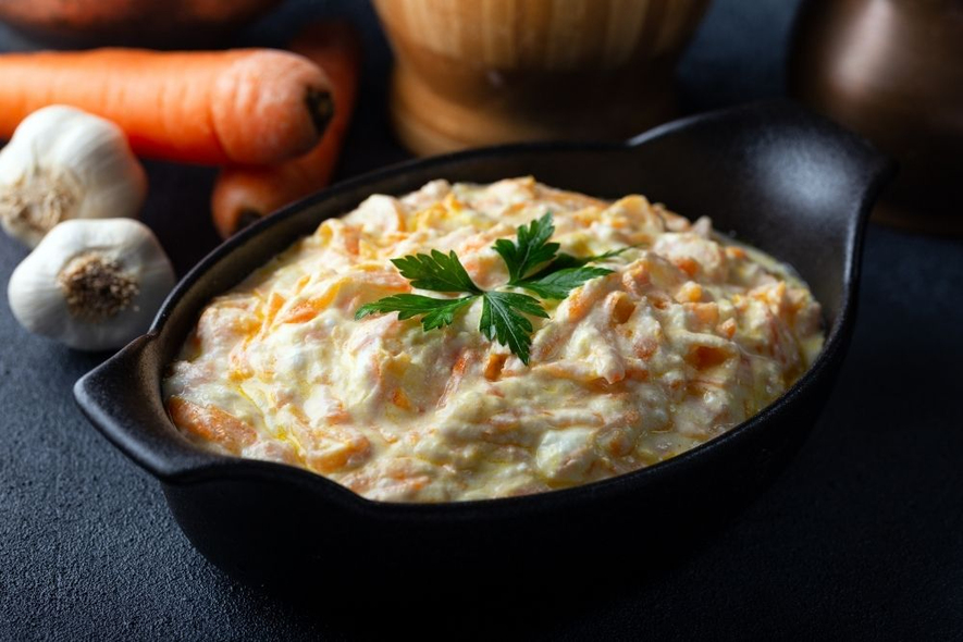- Geniş bir kabın içine soğuttunuz havuçları dökün ve üzerine yoğurt, süzme yoğurt, mayonez, sarımsak/sarımsak tozu, 1 yemek kaşığı zeytinyağ ve tuzu ekleyin.